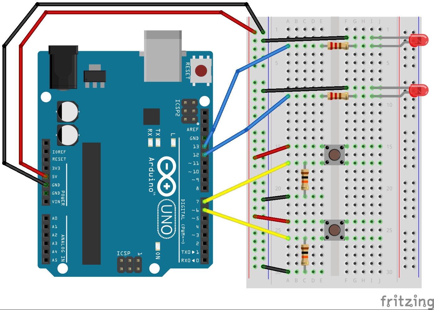 อัพโหลดโปรแกรมแล้วลองเล่นดูครับ ก็จะเห็นได้ว่ามันก็คือตัวอย่างที่ผ่านมานี่เอง เพียงแค่ผมก็ได้กำหนดชื่อให้ขาต่างๆไว้กันงงเวลาเขียนโปรแกรม (เรื่องนี้แบบละเอียดอยู่ในคอร์ส Basic Arduino นะครับ) และเพิ่มมันขึ้นมาเป็นสองชุด คือชุดแรก button_1 ควบคุม LED_1 และชุดที่สอง button_2 ควบคุม LED_2 |
