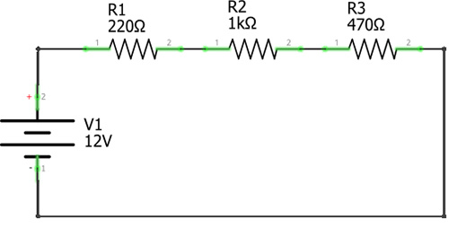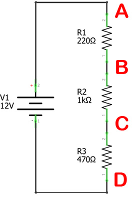 (1) ความต่างศักย์ระหว่างจุด A และ D = ความต่างศักย์ของแหล่งจ่ายไฟ = 12 V (2) ความต่างศักย์ระหว่างจุด A และ B = ความต่างศักย์ที่ตกคร่อม R1 = 1.562 V (3) ความต่างศักย์ระหว่างจุด B และ C = ความต่างศักย์ที่ตกคร่อม R2 = 7.1 V (4) ความต่างศักย์ระหว่างจุด C และ D = ความต่างศักย์ที่ตกคร่อม R3 = 3.337 V (A) หากต่อสายไฟที่จุด B และจุด C ไปใช้งาน จะได้แรงดันไฟเท่าไร? ตอบ เท่ากับแรงดันตกคร่อม R2 คือ 7.1 V |