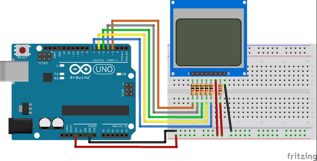 จากรูปตัวอย่างจะเห็นการเชื่อมต่อแบบ Software SPI โดยมีตัวต้านทานขนาด 10k เพื่อลดระดับ Logic จาก 5V ให้เหลือประมาณ 3.3V และใช้ตัวต้านทาน 330 เพื่อจำกัดกระแสให้กับ LED Backlight
