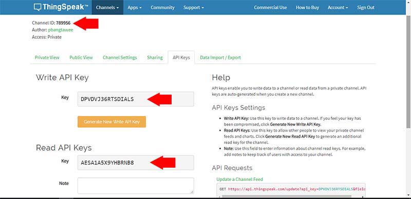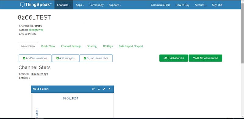 เตรียม Server Service แค่ทั้งนี้ การจะควบคุมข้ามวง LAN นั้นต้องมี Server ตัวกลางในการสื่อสาร ตัว ESP8266 อยู่ในวง WiFi บ้านเรา ตัวควบคุมสมมติว่าคือมือถืออยู่วงอื่น (WiFi บ้านอื่น หรือใช้เครือข่ายสัญญาณของผู้ให้บริการ) เมื่อกดคำสั่งแล้วก็ส่งข้อมูลไปไว้ที่ Server ก่อน จากนั้นจึงส่งไปที่ปลายทาง (หากมีความรู้เรื่องเครือข่ายขั้นสูงก็สามารถตั้งค่าให้สื่อสารกันโดยตรงก็ได้ แต่จะยุ่งยากมาก ไม่เหมาะกับการใช้งานระดับเริ่มต้นแบบเรา) สำหรับ Server หรือ Service ต่างๆก็มีให้ใช้บริการหลากหลาย แต่ในบทความนี้จะยกตัวอย่างของ Thingspeak ที่ https://thingspeak.com/ ทำการสมัครสมาชิกให้เรียบร้อย จากนั้นเราจะเตรียมความพร้อมเรื่อง API Key ต่างๆ โดยการคลิกที่ New Channel จากนั้นก็ใส่ชื่อโปรเจคของเรา ตั้งเป็นอะไรก็ได้ ในตอนนี้เรายังไม่ได้ใช้อะไรเลย อย่างอื่นก็ปล่อยไว้เหมือนเดิม เลื่อนมาล่างสุดคลิก Save Channel ก็จะได้หน้าจอ Channel ตามด้านล่าง