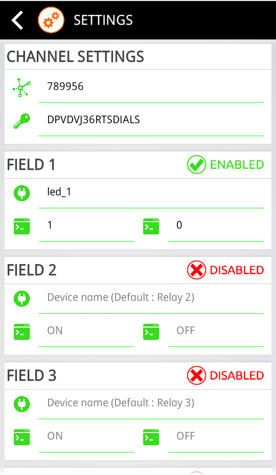 คลิกที่ API Keys จุดที่เราจะนำมาใช้งานคือ Channel ID, Write API Keys และ Read API Keys ให้เตรียมก็อปเตรียมจดตรงนี้ไว้ เตรียม Andriod Application ในตัวอย่างนี้จะควบคุมผ่าน Application บนโทรศัพท์มือถือ การเขียนแอปขึ้นใหม่ก็คงยุ่งยาก เสียเวลาเกินไปสำหรับการเรียนรู้ เราใช้ความเป็น Open Source ของ Android ให้เป็นประโยชน์โดยการไปค้นแอปใน Play Store ในที่นี้ขอใช้แอปที่ชื่อว่า Relay Control Internet (คลิกที่นี่) ตัวแอปจะมีหน้าตาแบบนี้ แตะเข้าที่ Settings ในช่อง Channel ID ให้ใส่ Channel ID บนหน้าเว็บลงไป ในช่อง API Keys ให้ใส่ Write API Keys ลงไป จากนั้นใน FIELD 1 แตะ DISABLED ให้เปลี่ยนเป็น ENABLED ทำการตั้งชื่อและใส่ค่าลงไป (ตัวอย่างจะทดลองควบคุมแค่หลอดเดียว จึงเปิดใช้แค่ FIELD เดียว) เพียงเท่านี้แอปของเราก็พร้อมใช้งานแล้ว รอเพียง ESP8266 ให้เชื่อมต่อรอรับคำสั่งเท่านั้น
