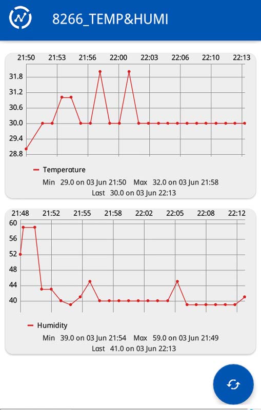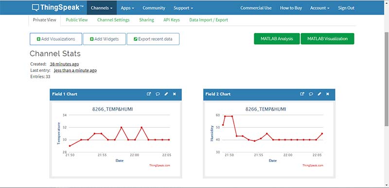 เมื่อกลับมาที่หน้า Channel ของเราใน ThingSpeak จะเห็นว่ากราฟทั้งสองถูกพลอตจะขึ้นมาตามการอัพเดทของข้อมูล (ตอนนั่งทำการเขียนบทความนี้ไม่ได้ทำในห้องแอร์ เห้อ อากาศเมืองไทยมันร้อนจริงๆ ดูสิ)