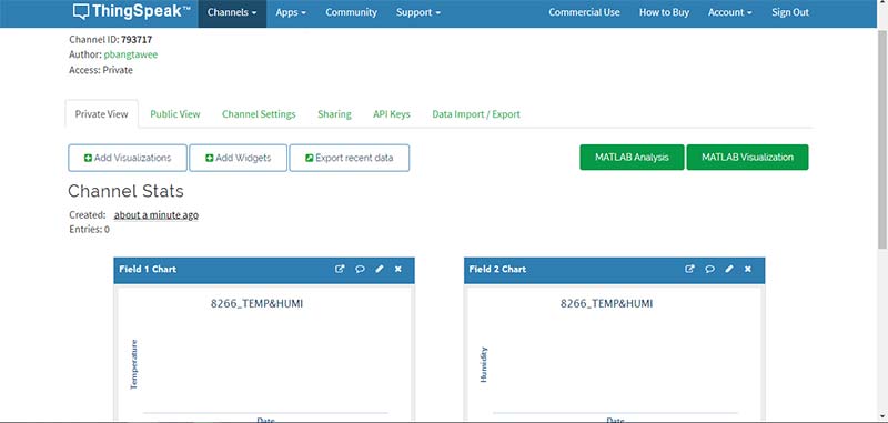 หลังจากเสร็จสื้นการสร้างก็จะขึ้นหน้า Channel ขึ้นมา ให้นำ Channel ID กับ API ไปใส่ในโค้ดตามเคย และหน้าตา Channel ของเราก็มีพื้นที่กราฟ 2 อันพร้อมที่จะพลอตข้อมูลแล้ว