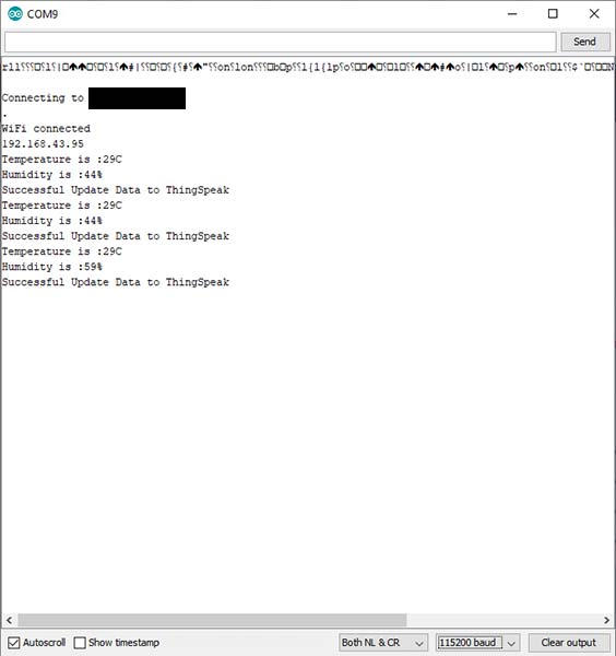 ทำการเปิด Serial Monitor ขึ้นมา จะเห็นว่ามีรายงานการส่งข้อมูลไปยัง ThingSpeak