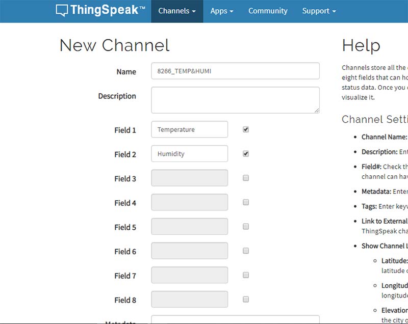 การสร้าง Channel ใน ThingSpeak ก็ทำเหมือนบทที่แล้ว แต่ครั้งนี้เราจะข้อมูล 2 ค่าคือค่าอุณหภูมิและความชื้น เราจึงต้องติ๊กถูกเพื่อเปิดใช้ filed 1 และ field 2 ตั้งชื่อให้เรียบร้อย ในตัวอย่าง field 1 คือค่าอุณหภูมิ และใน field 2 คือค่าความชื้น