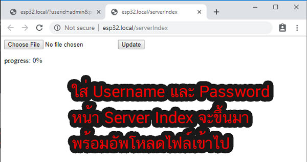 บนจอจะมีหน้าให้ใส่ User ID และ Password ให้ใส่ดังนี้ User ID ใส่ admin และ Password ใส่ admin กดปุ่ม Login จะเข้าสู่หน้า Server Index ซึ่งเป็นหน้าที่เอาไว้ใช้อัพโหลดไฟล์ เท่านี้ก็แสดงว่าตัว ESP32 ของเราพร้อมใช้งานแล้ว