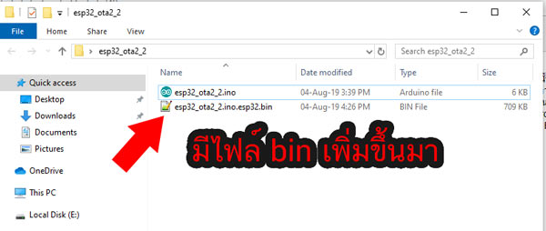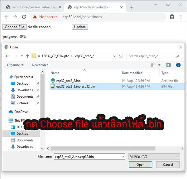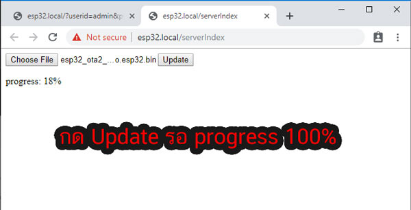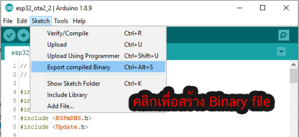 สำหรับการอัพโหลดโปรแกรมด้วยการทำ Web Server OTA นี้จะต่างจากการทำผ่าน ArduinoIDE OTA นิดนึง เราต้องทำเป็นไฟล์ Binary (นามสกุล .bin) ก่อนนะครับ แล้วจึงนำไฟล์ Binary นี้ไปอัพโหลดผ่าน Web Server OTA ลงบนบอร์ด เหตุผลที่ต้องทำเช่นนี้เพราะในระบบดิจิตอลอิเล็กทรอนิกส์ คอมพิวเตอร์รวมถึง Arduino หรือ ESP32 ของเรานี้ด้วย มันจะทำงานด้วยเลขฐานสองเท่านั้น โค้ดที่เราเขียนนี้มันไม่สามารถเข้าใจได้ มันจะเข้าใจเฉพาะชุดข้อมูลที่เป็น 1001100001110101 อะไรแบบนี้เท่านั้น ซึ่งหากเราใช้วิธีการอัพโหลดผ่านทาง ArduinoIDE เวลาเรากดอัพโหลด ตัวโปรแกรมจะมีการ Complier ก่อนทุกครั้ง การคอมไพล์นี้แหละครับมันคือขั้นตอนการเปลี่ยนภาษา C++ ที่เราเขียนให้เปลี่ยนเป็น Binary แล้วจึงเข้าสู่ขั้นตอน Upload แต่หากเราใช้ Web Server OTA มันเป็นการยัดไฟล์ใส่ไปใน ESP32 โดยตรง ฉะนั้นหากนำไฟล์ .ino ของ Arduino ไปใส่ย่อมไม่ได้ จึงต้องสร้างไฟล์ Binary ขึ้นมาก่อนโดยการคลิกที่ Sketch > Export complied binary ตัว ArduinoIDE จะทำการคอมไพล์ และสร้างไฟล์ Binary ขึ้นมา เมื่อคลิกไปแล้วก็จะมีการคอมไพล์ มีแถบสีเขียวขึ้นมา ก็ให้รอจนแถบเขียวเต็มและขึ้นว่า Done compiling ตามปกติ จากนั้นไปดูในโฟลเดอร์ที่เราเซฟโปรแกรมนี้ไว้ (ค่าปกติของ ArduinoIDE จะเซฟที่ Documents/Arduino) จะมีไฟล์นามสกุล .bin เพิ่มขึ้นมา เราจะใช้ไฟล์นี้แหละไปอัพโหลดผ่าน Web Server ตรงนี้บางเครื่องไฟล์ .bin อาจเป็นรูปกระดาษสีขาวเปล่าๆก็ไม่เป็นไรนะครับไม่ต้องสนใจ(ที่เป็นแบบนี้เพราะผู้เขียนใช้ Notepad++ เป็นโปรแกรมเริ่มต้นในการเปิด .bin ซึ่งปกติ Windows จะไม่ค่อยอยากให้เรายุ่งกับ .bin ในเครื่องเท่าไร เพราะไฟล์ระบบของเครื่องเป็น .bin มีเยอะมาก) เราสามารถก็อปปี้ ตัด ลาก ไฟล์ตัวนี้ของเราไปใส่แฟลชไดร์ แนบส่งเมล์หรืออะไรก็แล้วแต่เลยครับมันเป็นไฟล์ที่ระบบดิจิตอลอ่านออกแล้ว ทีนี้เราจะยัดมันลงไปใน ESP32 เปิดเบราเซอร์ของราขึ้นมา ใส่ IP Address ของเจ้า ESP32 ลงไป Login ด้วย Username Password ลงไป เมื่อขึ้นหน้า Server Index กด Choose file จะมีหน้าต่างเด้งขึ้นมาให้เลือกไฟล์ ก็ไปหาไฟล์ .bin ของเรา เก็บไว้ตรงไหนก็คลิกเลือกเปิดมันขึ้นมา กด Update รอทำการอัพโหลดไฟล์ โดยจะมีความคืบหน้าที่ progress ว่าเสร็จกี่เปอร์เซ็นต์แล้ว(อาจใช้เวลาเล็กน้อย) เมื่อครบ 100% ตัว ESP32 ของเราก็พร้อมใช้งานตามโปรแกรมที่เขียนลงไปแล้วครับ ขอย้อนไปโปรแกรมที่เราใช้กระพริบไฟ จะเห็นว่าได้ใช้คำสั่ง millis ทำการจับเวลาแทนการ Delay (เรื่องการใช้ millis นี้อาจผ่านตากันมาบ้าง ยังไงแล้วเดี๋ยวจะเขียนเล่าภายหลังครับ) เนื่องจาก delay นั้นจะทำการหยุดโปรแกรมไว้ตรงนั้น หากเราเรียกหน้าเว็บในตอนที่โปรแกรมมันหยุดเพราะคำสั่ง Delay อยู่ มันจะเรียกหน้าเว็บขึ้นมาไม่ได้ เพราะไม่ได้เจอคำสั่ง server.handleC