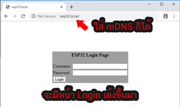 เหมือนบทที่แล้วครับ โค้ดเริ่มต้นนี้เราจะต้องอัพโหลดผ่านทางสาย USB ซะก่อน เป็นเหมือนโปรแกรมเริ่มต้นอันแรกสุด อัพโหลดเสร็จลองเช็คว่าตัว ESP32 Server ของเราทำงานได้ดี หน้าเว็บเราโอเค โดยการเปิด Browser ขึ้นมา (คอมพิวเตอร์ต้องต่อ WiFi วงเดียวกับ ESP32) ในช่อง Address Bar ให้ใส่ IP Address ของ ESP32 (สามารถเปิดดูได้จาก Serial Monitor โดยกด EN ที่บอร์ด 1 ครั้งเพื่อรีสตาร์ทบอร์ดใหส่วนแรกทำงาน และ IP Address นี้อาจเปลี่ยนค่าได้) หรือวิธีที่ง่ายกว่านั้นคือใส่เป็น mDNS ลงไปเลย เนื่องจากเราเขียนโค้ด mDNS ไว้ ในตัวอย่างนี้ตั้งค่า mDNS ไว้คือ esp32 จึงใส่ค่า http://esp32.local ลงไปใน Address Bar (เรื่อง mDNS เขียนไว้ในบทความชุด ESP8266 คลิกอ่านได้ที่นี่) หากทุกอย่างถูกต้อง บนจอจแสดงหน้า Login ขึ้นมา