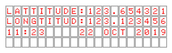 ในโปรเจคนี้ทำเป็นตัวอย่างให้ดูคร่าว ๆ ผู้เขียนจะออกแบบให้ข้อมุลแสดงบนหน้าจอตามภาพด้านล่างนี้ครับ อยากได้ข้อมูลแค่นี้แหละคือบรรทัดบนสุดเป็นค่า Lattitude บรรทัดที่สองจะเป็นค่า Longtitude บรรทัดที่สามเป็นเวลาและวันที่ ส่วนบรรทัดล่างสุดจะปล่อยว่างไว้ ให้ทุกท่านไปเพิ่มเติมตามใจครับ