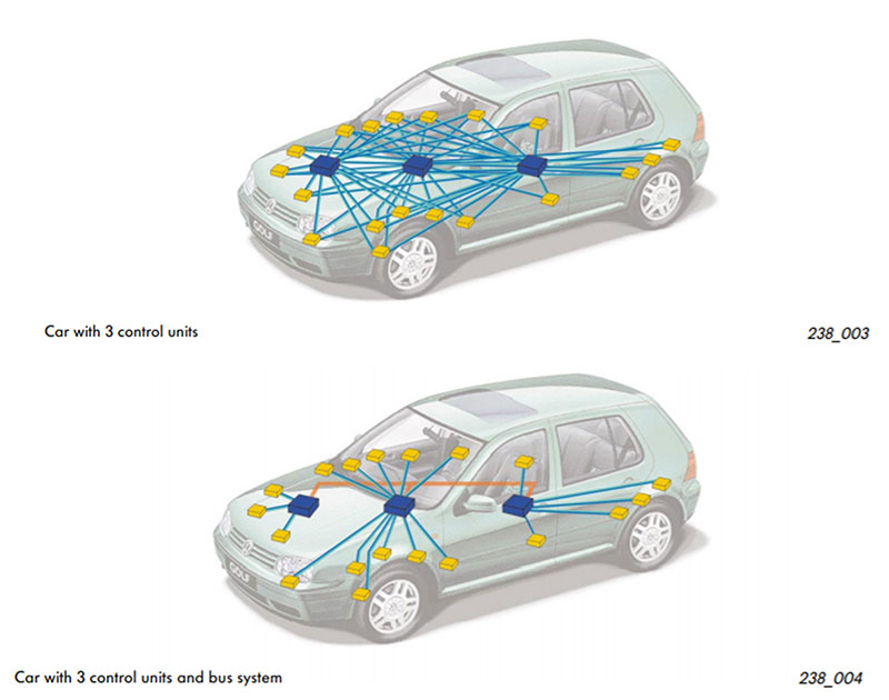 (รูปบน)การเชื่อมต่อกล่องควบคุม 3 กล่องแบบทั่วไป (รูปล่าง)การเชื่อมต่อโดยใช้ CAN BUS