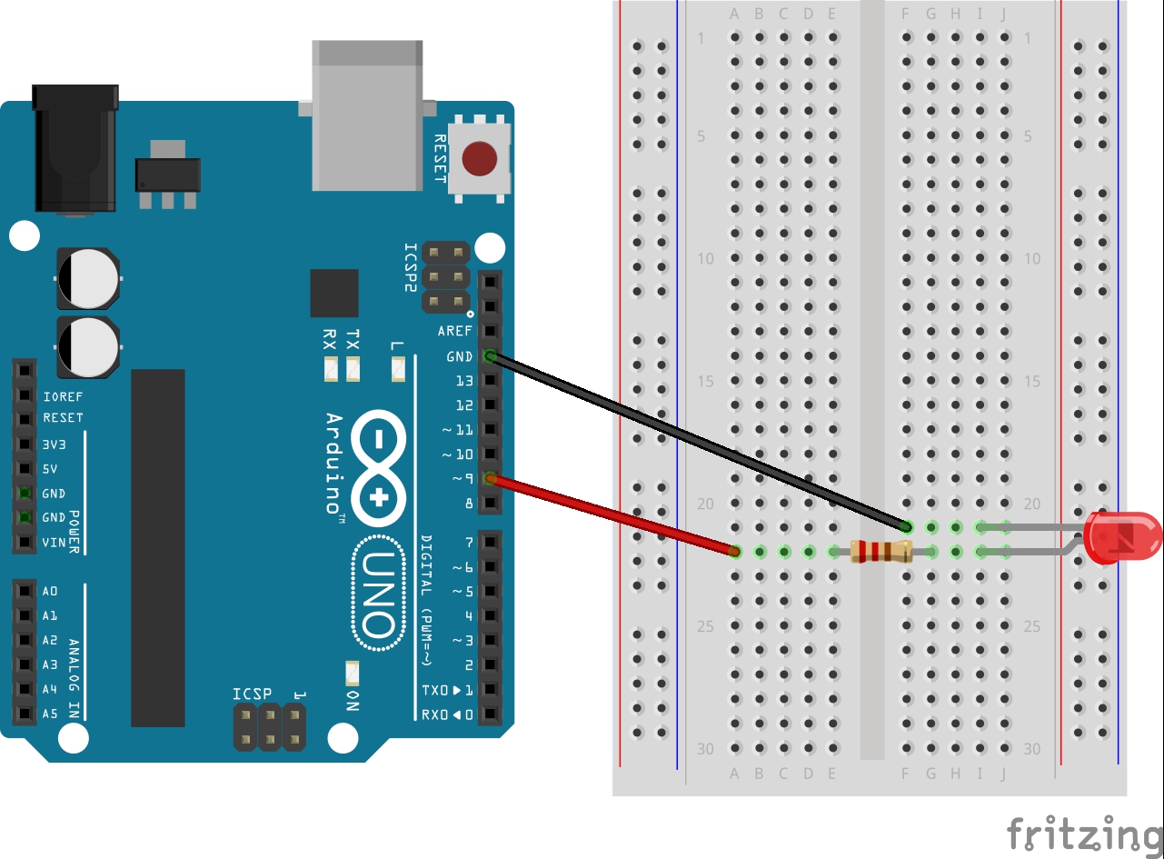 ทำการต่อวงจรตามรูป อัพโหลดโค้ดลงบอร์ดแล้วดูผลที่เกิดขึ้น จะเห็นว่าหลอด LED จะค่อยๆสว่างขึ้นทีละนิดๆ จนถึงจุดที่สว่างมากที่สุดแล้วค่อยๆหรี่ลงทีละนิดๆจนดับแล้ววนกลับมาเริ่มสว่างใหม่ |