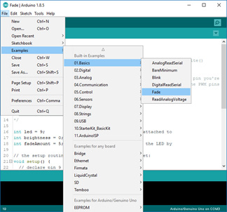เริ่มกันง่ายๆกับตัวอย่างที่โปรแกรมให้มาอีกเช่นเคย เปิด Arduino IDE ขึ้นมา คลิก File > Examples > 01.Basics > Fade | |