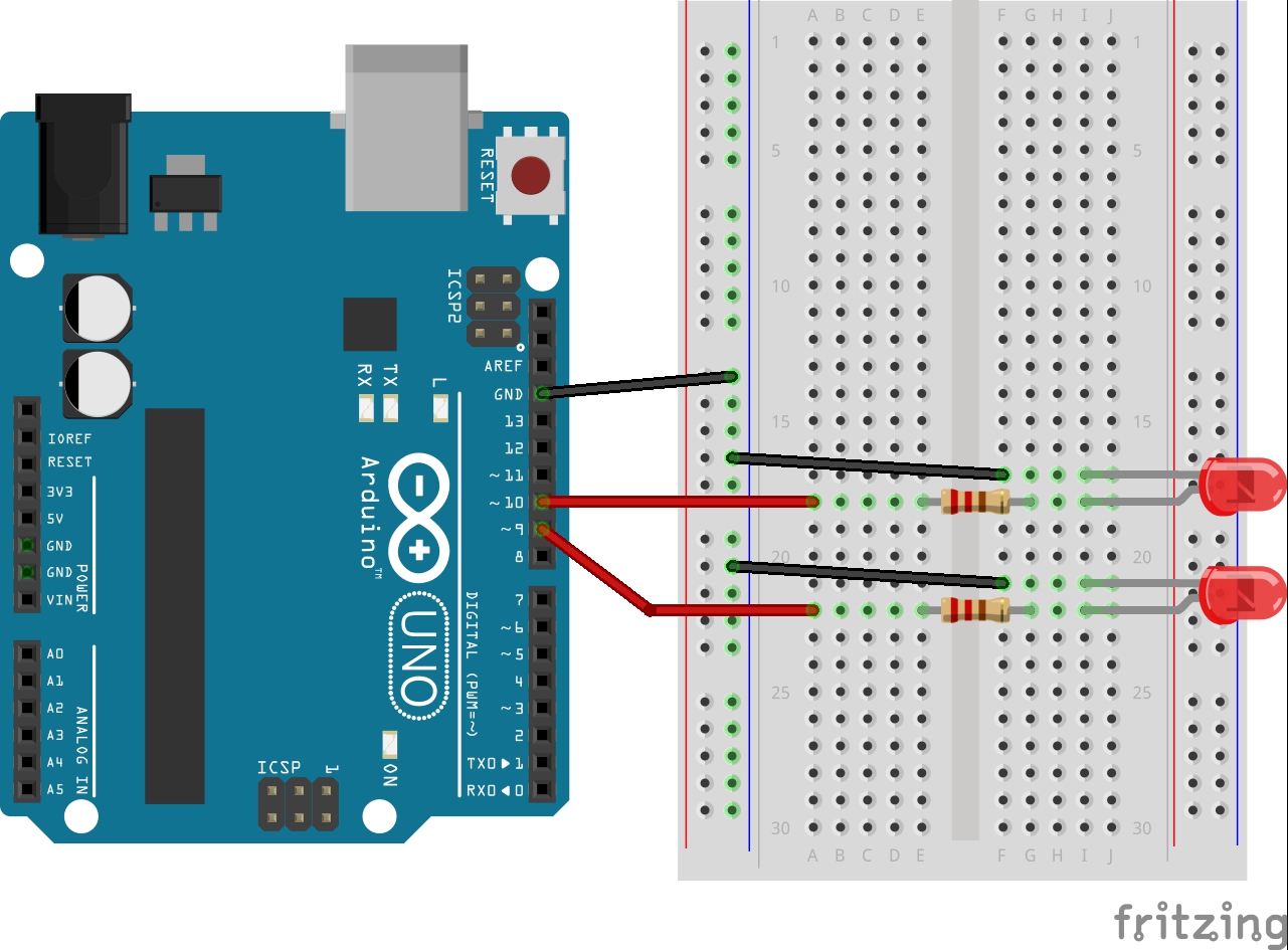 ครั้งนี้ได้เพิ่ม LED เป็น 2 ชุด แต่แทนที่จะให้มันค่อยๆสว่างแล้วก็ค่อยๆดับพร้อมกัน ผมได้ทำการกลับในส่วนของ led2 ทั้งหมดจากบวกเป็นลบ ค่าตอนเริ่ม led1 = 0 คือดับสนิท ของ led2 ก็ให้เป็น 255 สว่างสุดๆซะ ทีนี้มันก็จะทำงานสลับกัน ขณะที่ led1 ค่อยๆสว่าง led2 จะค่อยๆหรี่ลง | ||
