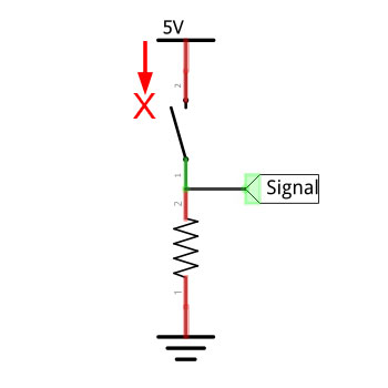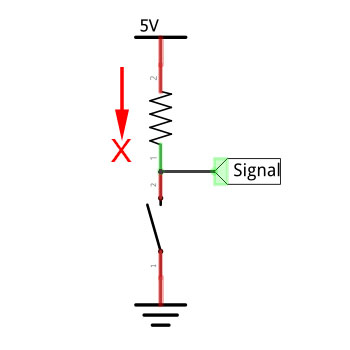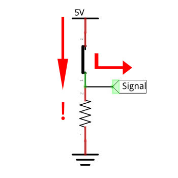 จริงอยู่ครับที่ว่าไฟฟ้าจะไหลจากความต่างศักย์สูงไปยังความต่างศักย์ต่ำเสมอ แต่อย่าลืมว่าเรามีสูตรพื้นฐานทางไฟฟ้า V=IR หากเราไม่ต่อตัวต้านทาน R ลงไป สูตรจะเป็น I=V/0 ซึ่งทางคณิตศาสตร์ไม่นิยาม ไม่สามารถคิดค่าคำตอบออกมาได้ ในทางปฏิบัติหากต่อแบบนี้แล้วนำสัญญาณเข้าไปใส่ Arduino (หรือ MCU ใด ๆ ก็ตาม) จะเกิดสถานะที่เรียกว่า "Floating" เป็นสถานะที่ขาของ MCU ไม่ได้ต่อกับ GND หรือ VCC ใด ๆ เลย หากเราเขียนโปรแกรมให้อ่านค่า Floating นี้ ค่าที่อ่านได้จะเป็นค่าที่กระโดดไปมา สุ่ม ๆ ออกมาเรื่อย ๆ นั่นเอง