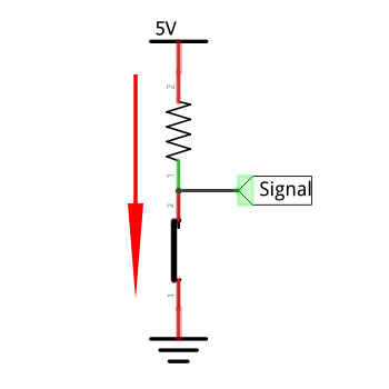คราวนี้มาพิจารณาเมื่อเรากดปุ่ม (1) สวิตช์เชื่อมวงจรทำให้วงจรปิด (2) ไฟฟ้าไหลจาก VCC ลงไปยัง GND แต่ทางลงไป GND มีตัวต้านทานต้านอยู่ ทำให้ไฟฟ้าไหลไม่สะดวก (3) ตามนิสัยของไฟฟ้าที่จะไหลไปยังทางที่สะดวกเสมอ แต่เมื่อทางไป GND ที่สะดดวกที่สุดดันมีตัวต้านทานมาขวางความสะดวกในการไหล ทำให้เหมือนไฟฟ้าโดนกักอยู่ตรงจุดที่เราจะต่อสัญญาณออกไปใช้งาน (4) จุดสังเกตอีกอย่างคือดูดี ๆ จะเห็นจุดที่เรานำสัญญาณไปใช้ได้ต่ออยู่กับ VCC โดยตรง เมื่อวัดตรงจุดนี้ก็จะพบว่ามีแรงดันเท่ากับ VCC