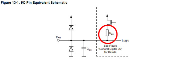 นอกจากการต่อวงจรจากภายนอกแล้ว ใน MCU ต่าง ๆ ทั้ง PIC, AVR, และอื่น ๆ ก็จะมีตัวต้านทานติดตั้งกับขา I/O ไว้ภายในตัวชิปแล้ว ช่วยให้เราสามารถต่อกับสวิตช์ได้ทันทีโดยไม่ต้องมีตัวต้านทาน เพราะเราจะใช้ตัวต้านทานที่ติดตั้งอยู่ภายในตัวชิปแทนนั่นเอง สำหรับ MCU ตระกูล AVR ที่นำมาใช้ในบอร์ด Arduino นั้นจะมีตัวต้านทานติดตั้งมาเป็นแบบ Pull-Up ตามภาพด้านล่างเป็น Diagram I/O ของ ATmega328p ที่ใช้ใน Arduino UNO, NANO จะเห็น Pull-Up Resistor แสดงอยู่ในวงกลมสีแดง